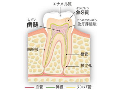 歯髄は歯の中心部に存在し、神経のほか、血管やリンパ管が集合した組織です。歯に水分や栄養を届ける働きや、歯の内部への細菌侵入を防ぐ働き、傷ついた歯の硬組織(象牙質)を修復する働きなど、歯を健康に保つ上で重要な役割を担っています。