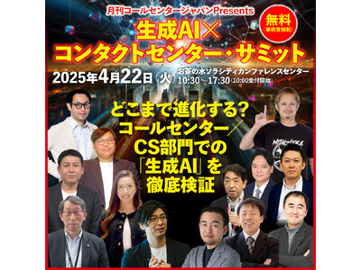株式会社リックテレコムが発行する「月刊コールセンタージャパン」編集部は、2025年4月22日(火)、オフラインイベント「生成AI × コンタクトセンターサミット」を東京都・御茶ノ水の御茶ノ水ソラシティカンファレンスセンターで開催します。