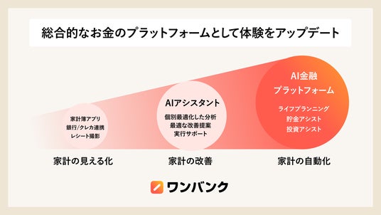 AIアシスタントが「家計の改善」までをサポートし、その先にある「貯める」「増やす」までを包括的にサポートしていきます。人々のお金に関する悩みをワンストップで解決できる金融プラットフォームを目指し、名称を「ワンバンク」に変更しました。