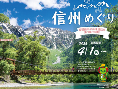 NEXCO東日本(本社・東京都千代田区、代表取締役社長・由木文彦)とNEXCO中日本(本社・名古屋市中区、代表取締役社長CEO・縄田正 )は、信州キャンペーン実行委員会(会長・阿部守一長野県知事)と連携して、2025年4月1日(火)から、長野県内の高速道路が定額で乗り降り自由となるETC車限定の企画割引「信州めぐりフリーパス」を発売します。