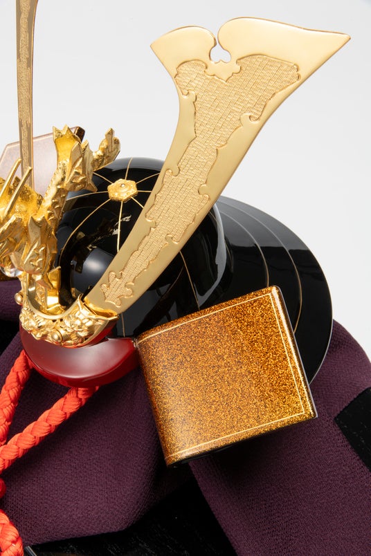 【兜の仕様】桧製木地・代用漆塗装・本金粉手描き蒔絵・本金箔押し・銅製手打ち金具金めっき仕上げ・正絹房