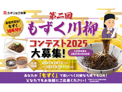 海藻の総合メーカーであるカネリョウ海藻株式会社(代表取締役社長:高木良樹 所在地:熊本県宇土市笹原町1544)は、昨年大好評を博した『第1回 もずく川柳コンテスト』に引き続き、今年も『第2回 もずく川柳コンテスト』を開催しています。また、このたび『第2回 もずく川柳コンテスト』の応募締切となる3月31日(月)まで残すこと約1週間となりましたことをお知らせします。『もずく川柳コンテスト』 は、一昨年の『めかぶ川柳コンテスト』からスピンオフ企画として誕生し、もずくにまつわるユニークな作品を募集しています。