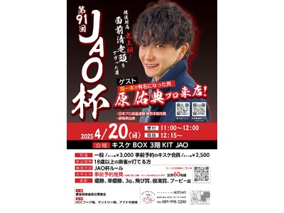 総合エンターテイメント企業・キスケ株式会社(本社:愛媛県松山市、代表:山路義則)が運営する日本最大級の個室麻雀店「キスケ KIT JAO」(キットジャオ)(愛媛県松山市)は、「指一本で有名になった男」として親しまれるプロ雀士、原佑典プロを『第91回JAO杯』のゲストとしてお招きします!