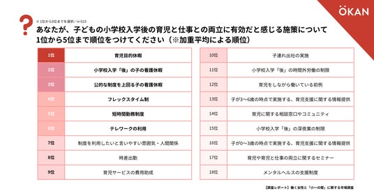 仕事と育児との両立に関わる制度のうち「小一の壁」に有効だと感じる施策を1位から5位まで選択してもらい、加重平均により順位づけしたところ、休暇制度や柔軟な働き方に関する施策が上位に挙がりました。