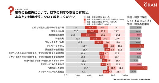 制度・支援が存在する場合の利用率を見ると、「子連れ出社の実施」が最も高く74.1%、「テレワークの導入」が60.4%と続いています。一方、「育児や育児と仕事の両立に関するセミナー」「メンタルヘルスの支援制度」などは利用率が低い傾向にあります。
