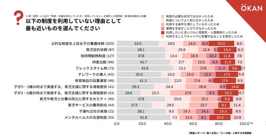 また、「公的な制度を上回る子の看護休暇」「テレワークの導入」「メンタルヘルスの支援制度」は、「制度が必要ではなかった」以外で「利用したいと言いづらい雰囲気・人間関係だったため」を理由に制度を利用していない人が最も多いことがわかりました。
