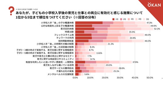 あなたが、子どもの小学校入学後の育児と仕事との両立に有効だと感じる施策について、1位から5位まで順位をつけてください [1位から5位までを選択/n=515]