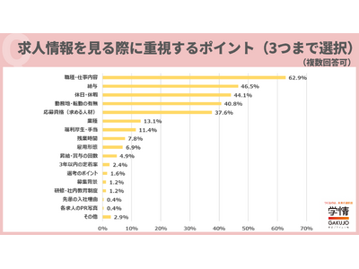 職歴のある20代後半~30代が求人情報を見る際に重視するポイントは、「職種・仕事内容」が62.9%で最多。次いで「給与」46.5%、「休日・休暇」44.1%が続きました。