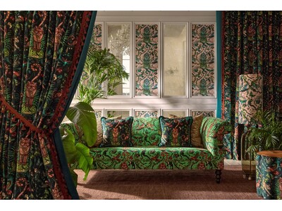 スコットランドの高地やギリシャの古い寺院、コスタリカの熱帯雨林など、世界の様々な地でエマが得たインスピレーションが、豊かな色彩と緻密な手描きのイラストとともに個性豊かなデザインへと昇華されています。自然や動物をこよなく愛するエマならではデザインが、コットン、ベルベッド、ジャガードなど多彩な素材の生地と壁紙で展開され、空間に魔法のような魅力と驚きをもたらします。