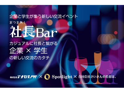 「企業の情報と印象をデザインする」をコンセプトに掲げ、メディアとWEBとオフラインを融合させたマーケティング戦略を提供する、株式会社アナログPR(本社:東京都港区、代表取締役:松浦啓介)は、株式会社Spotlight(代表取締役:松本隼和)および合同会社さいきんの若者は(本社/代表取締役:宮本伊織)と共同で、企業と学生が集う新しい交流イベント「社長Bar カジュアルに社長と繋がる企業×学生の新しい交流のカタチ」を2025年3月4日に開催いたしました。