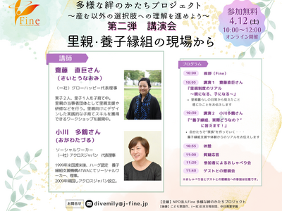 不妊治療患者をはじめ不妊・不育で悩む人をサポートするセルフサポートグループNPO法人Fine(ファイン)の「多様な絆のかたちプロジェクト」は、4月12日(土)に、第二弾として講演会「里親・養子縁組の現場から」をオンラインで実施いたします。