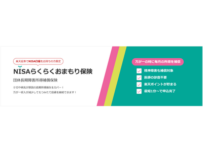 楽天証券株式会社(本社:東京都港区、代表取締役社長:楠 雄治、以下「楽天証券」)と、損害保険ジャパン株式会社(本社:東京都新宿区、代表取締役社長:石川 耕治、以下「損保ジャパン」)および楽天インシュアランスプランニング株式会社(本社:東京都港区、代表取締役社長:酒井 将平、以下「楽天インシュアランスプランニング」)は、2025年3月23日(日)より、楽天証券のNISA※1口座を保有するお客様を被保険者とする団体長期障害所得補償保険(以下「GLTD※2」)、「NISAらくらくおまもり保険」の提供を開始することを、お知らせします。なお、NISA口座保有者を被保険者とするGLTDは、国内で初めて※3です。