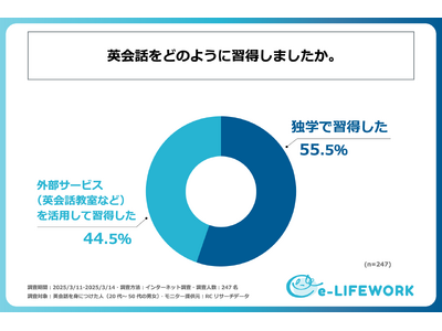 近年、グローバル化が加速する中で、英会話スキルの必要性が一層高まっています。特に、4月の新年度を迎えるにあたり、新たな環境でのスタートを控え、「何か新しいことを始めたい」と考える人も多いのではないでしょうか。その中でも、キャリアアップや自己成長の一環として、英会話の習得に取り組む人は少なくありません。しかし、英会話の習得方法にはさまざまな選択肢があり、独学で学べるものなのか、また、英会話スクールは効果があるのか、といった疑問を抱く方もいるものと考えられます。では、実際に英会話を習得した人々はどのような学習法で、どのくらいの時間を費やして英会話を習得したのでしょうか。そこで、株式会社e-LIFEWORKは、英会話を習得した方を対象に「学習方法とその効果」に関する実態を明らかにするための調査を実施しました。