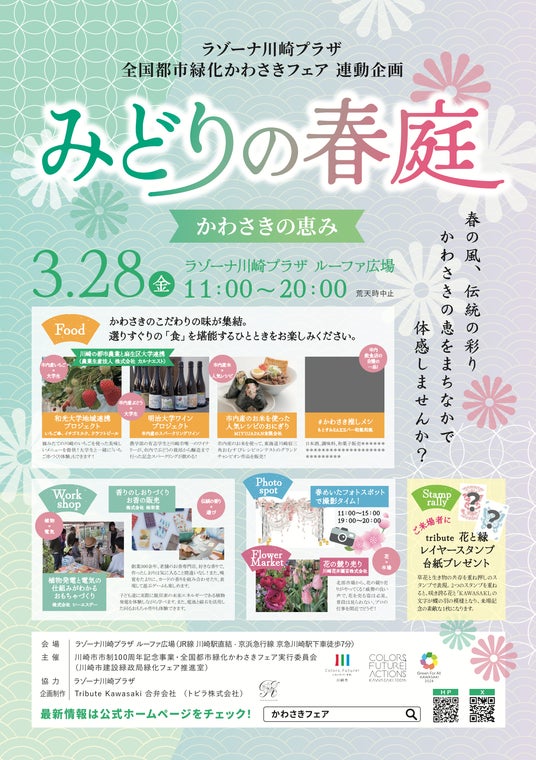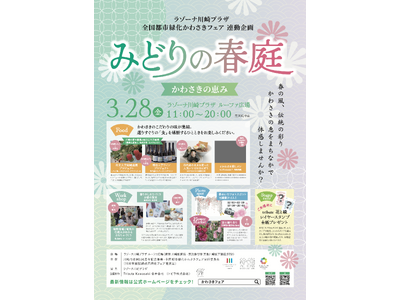 令和7(2025)年3月22日(土)に春会期がスタートした市制100周年記念事業の象徴的事業である「全国都市緑化かわさきフェア」と連携して、ラゾーナ川崎プラザのルーファ広場にて、「まちなかで”春”や”かわさきの恵み””伝統”を感じる」をコンセプトに、市内産の農産物の恵みを味覚で、伝統的な香りを嗅覚で、花の美しさを視覚で感じていただける、“みどり”の魅力があふれるイベントを実施します。