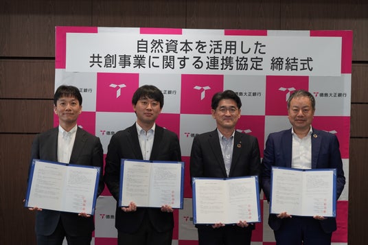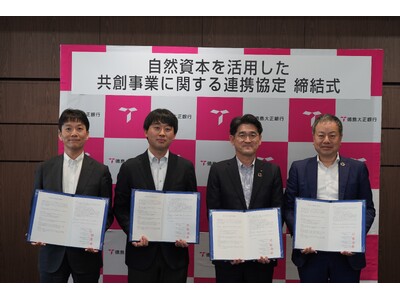 トモニホールディングスグループの株式会社徳島大正銀行(本店:徳島県徳島市、代表取締役頭取・板東 豊彦)と、その子会社で地域の脱炭素化の推進や自然資本を活用した一次産業活性化などを行うとくぎんトモニリンクアップ株式会社(本社:徳島県徳島市、代表取締役社長・天野 嘉彦)および飛騨五木株式会社(本社:岐阜県高山市、代表取締役:井上 守)と株式会社森とみずのちから(本社:奈良県下市町、代表取締役社長・貝本 隆三)は「自然資本を活用した共創事業に関する連携協定」を締結しました。
