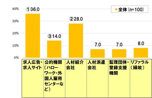 「求人広告・求人サイト(36.0%)」が最も高く、次いで「人材紹介会社(28.0%)」、「公的機関(ハローワーク・外国人雇用センターなど)(14.0%)」という結果になりました。