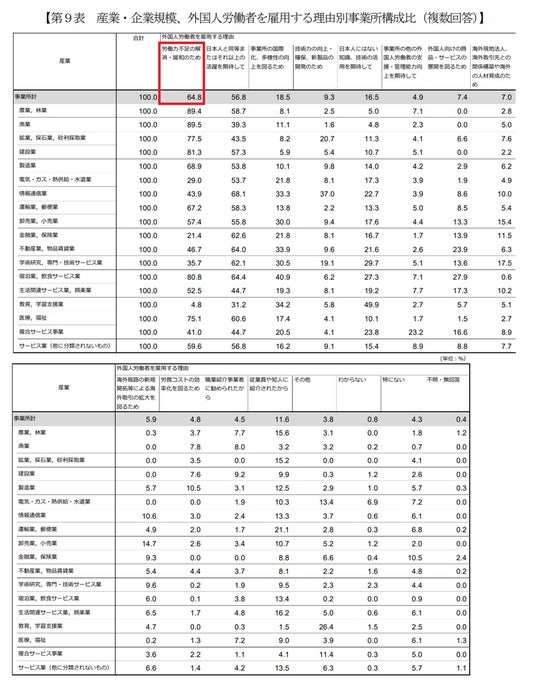 「求人広告・求人サイト」を利用する割合が他の方法よりも高いことに加え、厚生労働省の調査では外国人労働者を雇用する理由1位が「労働力不足の解消・緩和のため」となっていることから、