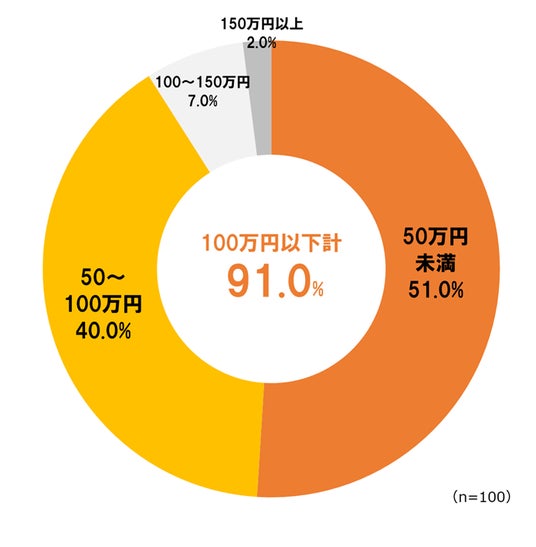 全体の91.0%が100万円以下(50万円未満51.0%、50~100万円40.0%)という結果になりました。
