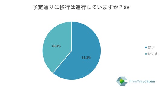 Q3で「老朽化した基幹システムの刷新」、もしくは「これまで手動で行っていた作業の、ツール・自動化への移行」と答えた方に、予定通りに移行は進行しているか聞いたところ、「はい」が61.1%、「いいえ」が38.9%という結果だった。