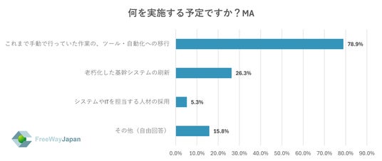 Q2で「はい」と回答した方に、何を実施する予定か聞いたところ、「これまで手動で行っていた作業の、ツール・自動化への移行」が78.9%、「老朽化した基幹システムの刷新」が26.3%、「システムやITを担当する人材の採用」が5.3%、その他が15.8%という結果だった。