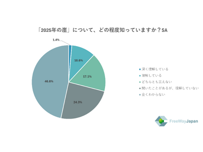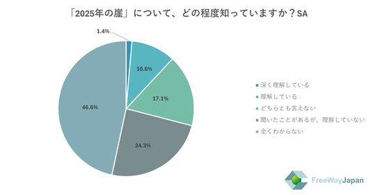 「2025年の崖」についてどの程度知っているか聞いたところ、「全くわからない」が46.6%、「聞いたことがあるが、理解していない」が24.3%、「どちらとも言えない」が17.1%、「理解している」10.6%、「深く理解している」1.4%という結果だった。