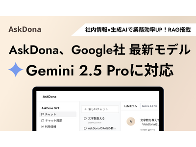株式会社GFLOPS(本社:東京都渋谷区、代表取締役CEO:盛本マリア、共同代表:鈴木亮祐)は、法人向けRAG活用プラットフォーム「AskDona」のGPTチャット機能において、Google社の最新モデル「Gemini 2.5 Pro(gemini-2.5-pro-exp-03-25)」に対応したことをお知らせいたします。