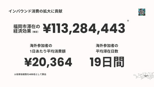 福岡市滞在の経済効果は推定約1.1億円を記録。海外参加者は平均滞在日数19日、1日あたりの平均消費額は20,364円で、長期滞在型インバウンド市場の可能性を示しました。また、日本全体の平均滞在日数は36日で、観光とビジネスを融合させた誘致戦略が、新たな市場を創出しました。