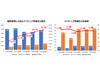 2025年1月のFP1級学科試験において、総受検者4,782名のうちFPキャンプ受講生が占める割合は32.2%※1となり、全体の3割超に達しました。FPキャンプが開講した2023年7月以降、受検者に占める受講生の割合は5回連続で右肩上がりの成長を続けています。また、今回のFPキャンプ受講生の合格率は77.92%※2と、全体の合格率16.81%の4.6倍を記録。2023年7月以降の試験において、5回連続で全体合格率の4.5倍を超える高い合格率を達成しています。