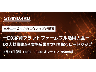 大手企業を中心に1,000社以上のデジタルトランスフォーメーション(以下、DX)の推進と内製化を支援する株式会社STANDARD(本社:東京都港区、代表取締役社長:伊藤 海)は、3月31日(月)12時より、Webセミナー『"自社ニーズへのカスタマイズが重要"DX教育プラットフォームフル活用大全-DX人材戦略から実務成果まで打ち取るロードマップ』を開催いたします。