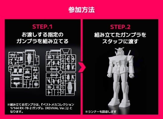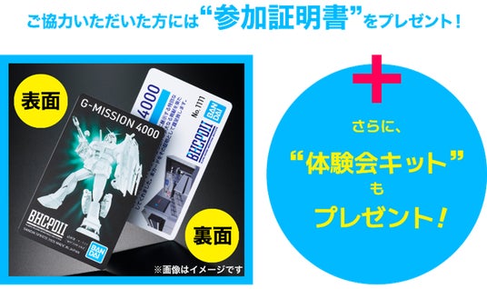 「G-MISSION 4000」とは、今夏竣工予定のバンダイホビーセンター新工場では 成形機1台あたり 4,000体分のランナーが製作されることを知ってもらうためにファンの皆さんに協力いただき4,000体のガンプラを新工場に展示するプロジェクトです。ご協力いただいたガンプラはバンダイホビーセンター新工場に展示されます。