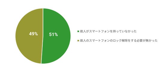 一方、ロック解除を試みなかった遺族に理由を尋ねたところ、「故人がスマートフォンを持っていなかった」(51%)と「ロック解除の必要がなかった」がほぼ同数で最多となりました。