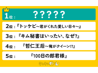 1位は切ないラブストーリーを描く作品『愛の不時着』に決定!その人気は韓国国内にとどまらず全世界で大ヒットしました。2位は社会現象を起こした大人気ファンタジー・ロマンス『トッケビ~君がくれた愛しい日々~』。3位は恋愛下手な大人同士のロマンスドラマ『キム秘書はいったい、なぜ?』。4位は『哲仁王后~俺がクイーン!?』。そして、5位は『100日の郎君様』がランクインしました!