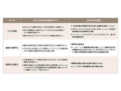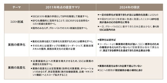 シェアードサービス活用による間接業務の集約化効果は、長らく業務の効率化・標準化に照準が置かれてきた。その重要性は2011年時点から引き続き変わらないものの、その進捗は2024年時点においても多くの日本企業で道半ばであった。その阻害要因は、SSCによる改革に向けたアプローチである「経営トップのリーダーシップ」「能力・スキルの獲得」「改革し続ける文化の定着」が十分に実現できていないことであることが明確となった。