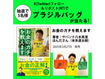 「ブラジルの人聞こえますか~!」のギャグでおなじみ、2024年には難関国家資格・FP1級にも合格したサバンナ八木真澄が、YouTube登録者数25万人超の「ほんださん/東大式FPチャンネル」を運営するほんださん(本多遼太朗)との共著で「お金と正解」を説く最新刊『FP1級取得!サバンナ八木流 お金のガチを教えます』が2025年3月27日(木)に発売。これを記念して、3月27日(木)正午よりX(Twitter)にてブラジルバッグプレゼントキャンペーンを行います。