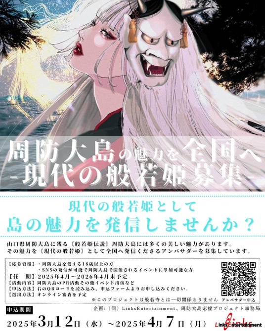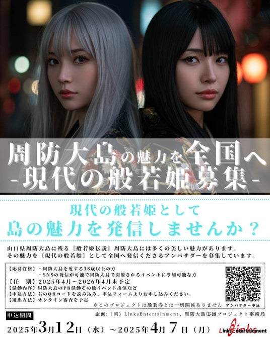 本企画では、18歳以上で周防大島に愛着を持ち、SNSを活用した発信活動が可能な方を対象に「現代の般若姫」としてのアンバサダーを募集します。