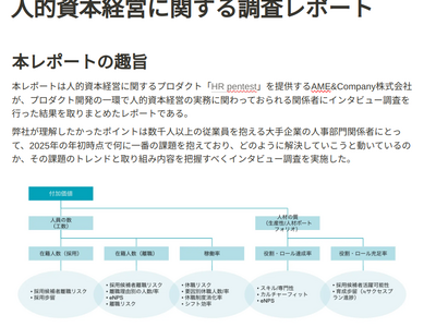 AME&Company株式会社は、人的資本経営に特化したプロダクト「HR pentest」の一環として、数千人以上の従業員を抱える大手企業の人事部門関係者に対するインタビュー調査を実施し、その結果をまとめた最新のレポートを公開しました。本レポートでは、2025年に向けて企業が直面する人的資本経営における主要課題、特に「離職・定着」と「人材の質(生産性/人材ポートフォリオ)」に関する問題を深掘りしています。