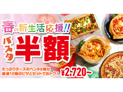 「大人気ピザ10種(Mサイズ限定)+選べるパスタ8種類」のご注文でパスタが半額になる。