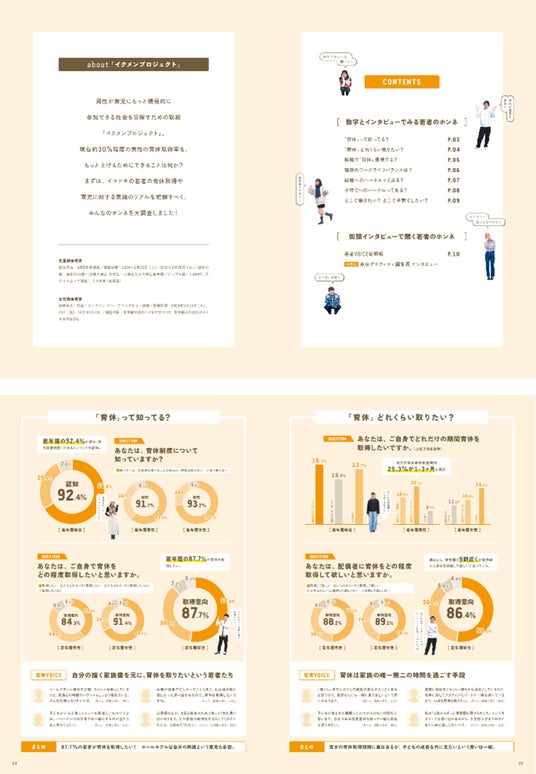これらの調査結果に加え、この度公表した「若年層調査冊子」では、本プロジェクトで実施した若者へのグループインタビューや、街頭インタビューの内容も掲載しております。昨今の若者の育休取得や育児に対する意識を把握し発信することで、特に男性の育児休業取得への社会的機運を高めるとともに、企業における育児休業取得促進、若手人材の確保・定着を図っていただきたいと考えています。