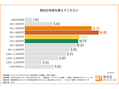 ITエンジニアのマネジメント層の年収は501~600万円の層が最も多く、約8割が501万円以上の年収帯に属していることがわかりました。
