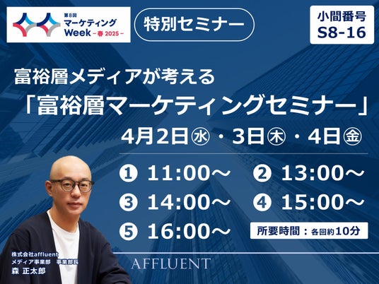 株式会社affluent(東京都港区、代表取締役社長:高山勇樹)は、2025年4月2日(水)から4日(金)まで、東京ビッグサイト・南展示棟(東京都江東区)で開催される「第8回 マーケティング Week - 春 2025 -」にブースを出展いたします。