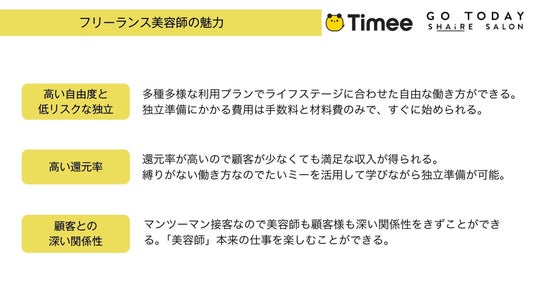 本セミナーでは、フリーランス美容師のメリットや具体的なキャリアアップの方法を紹介し、タイミーが提供するスキマ時間を活用した働き方と、GO TODAY SHAiRE SALONの継続的なキャリア形成を支援するプラットフォームを掛け合わせ、美容師が柔軟かつ安定して独立できる環境を提供します。