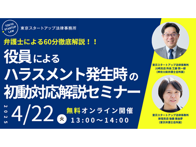 労使双方の労働問題に取り組む東京スタートアップ法律事務所が、経営者、役員、管理職の方を対象に、「役員によるハラスメント発生時の初動対応」をテーマに、オンラインセミナー(無料)を開催。