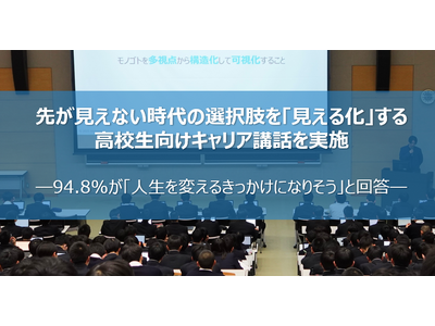 科学技術と産業」企業講話に登壇しました。「キャリアパスを図解で考える」をテーマに、同校の1年生約320名が参加。講話後のアンケートでは94.8%の生徒が「人生を変えるきっかけになりそう」と回答しました。