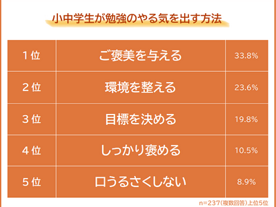 ・小学生・中学生が勉強のやる気を出す方法1位は「ご褒美を与える」