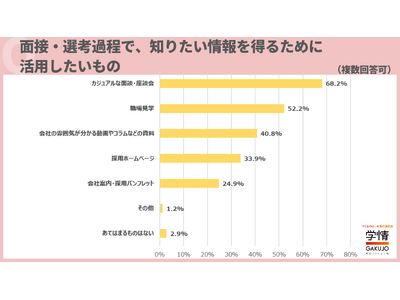 面接・選考段階で知りたい情報を得るために活用したいものについては、「カジュアルな面談・座談会」が68.2%で最多となりました。次いで、「職場見学」52.2%、「会社の雰囲気が分かる動画やコラムなどの資料」40.8%が続きました。