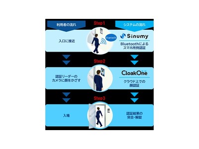 本実証実験では、TOPPANエッジのオフィス認証クラウドサービス「CloakOne(R)」の顔認証機能と、Sinumyが提供するスマートフォンのBluetoothを活用した独自の非接触認証技術「Sinumy Technology」を組み合わせた多要素認証システムを使用します。具体的には、三菱HCキャピタルの施錠管理されているオフィスドアに認証機器を設置し、顔認証とBluetoothによる認証技術を組み合わせた入退室管理を行います。ハンズフリーで利便性が高く、かつ誤認証のリスクを大幅に低減したスマート認証の確立を目指し、サービス提供開始にむけた課題を検証します。