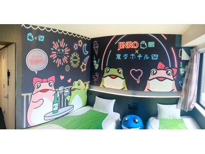 「チャミスルルーム」は、眞露のキャラクターであるカエルの「トゥッコビ」と、ネオンをイメージした壁面で、韓国ナイトライフの世界観を演出しております。また、「チャミスル」のラベルをあしらったベッドカバーのデザインや、トゥッコビのぬいぐるみやフィギュアも設置。韓国気分を味わえる特別な空間となりました。ぜひトゥッコビたちと一緒に、「チャミスルルーム」でのチャミスルをお楽しみください!