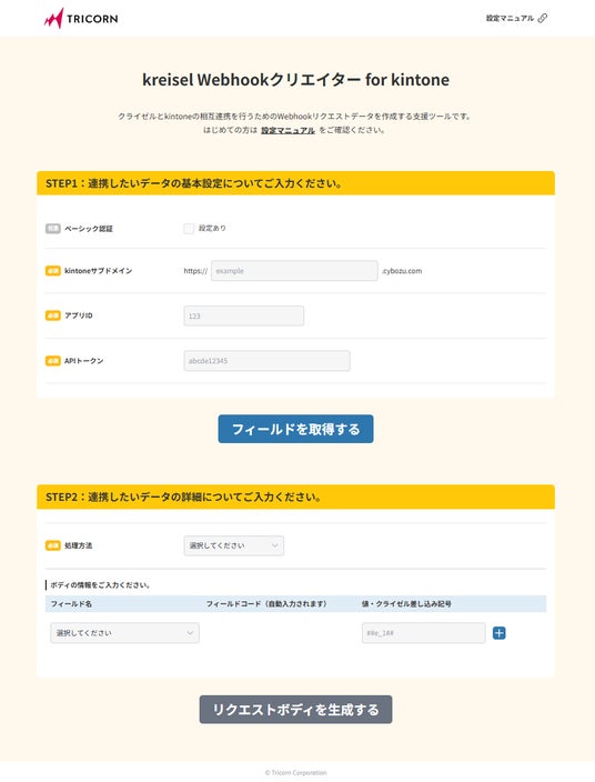 「kreisel Webhookクリエイター for kintone」画面イメージ