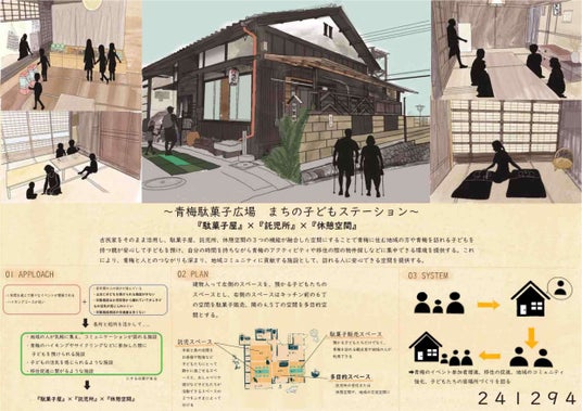 駄菓子屋が持つ、世代を超えた交流の場としての価値に着目し、さらに託児所や休憩スペースを設けることで、地域コミュニティの核となる可能性を示した点が評価されました。また、対象物件の雰囲気にも合致するアイデアであることも、受賞の決め手となりました。