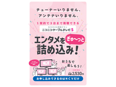 NCVではこれまで、多チャンネルサービスの拡充や利便性の向上に向け、さまざまな取り組みを行ってまいりました。「ニコニコケーブルテレビS」は、そうした取り組みの成果として誕生した新しいサービスです。今後もNCVは、地域の皆さまにテレビをより一層楽しんでいただけるサービスを提案し、安心・快適にご利用いただける環境づくりを通して、地域社会の発展に貢献してまいります。